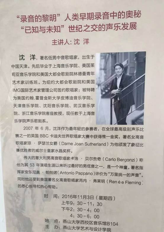 2016年11月3日,365英国上市公司邀请著名男中音歌唱家沈洋老师在音乐馆104举行大师公开课。