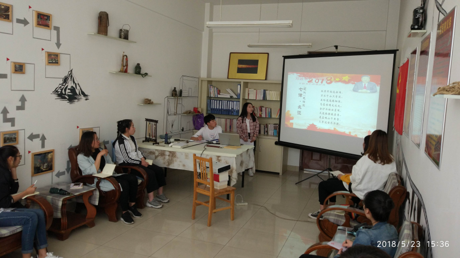 全体成员首先观看了题为“改变-习近平治国理政这四年”的开场视频,之后杨茹慧同学带领大家赏析了红歌《东方红》,并带领大家集体朗诵革命史诗《七律·长征》。